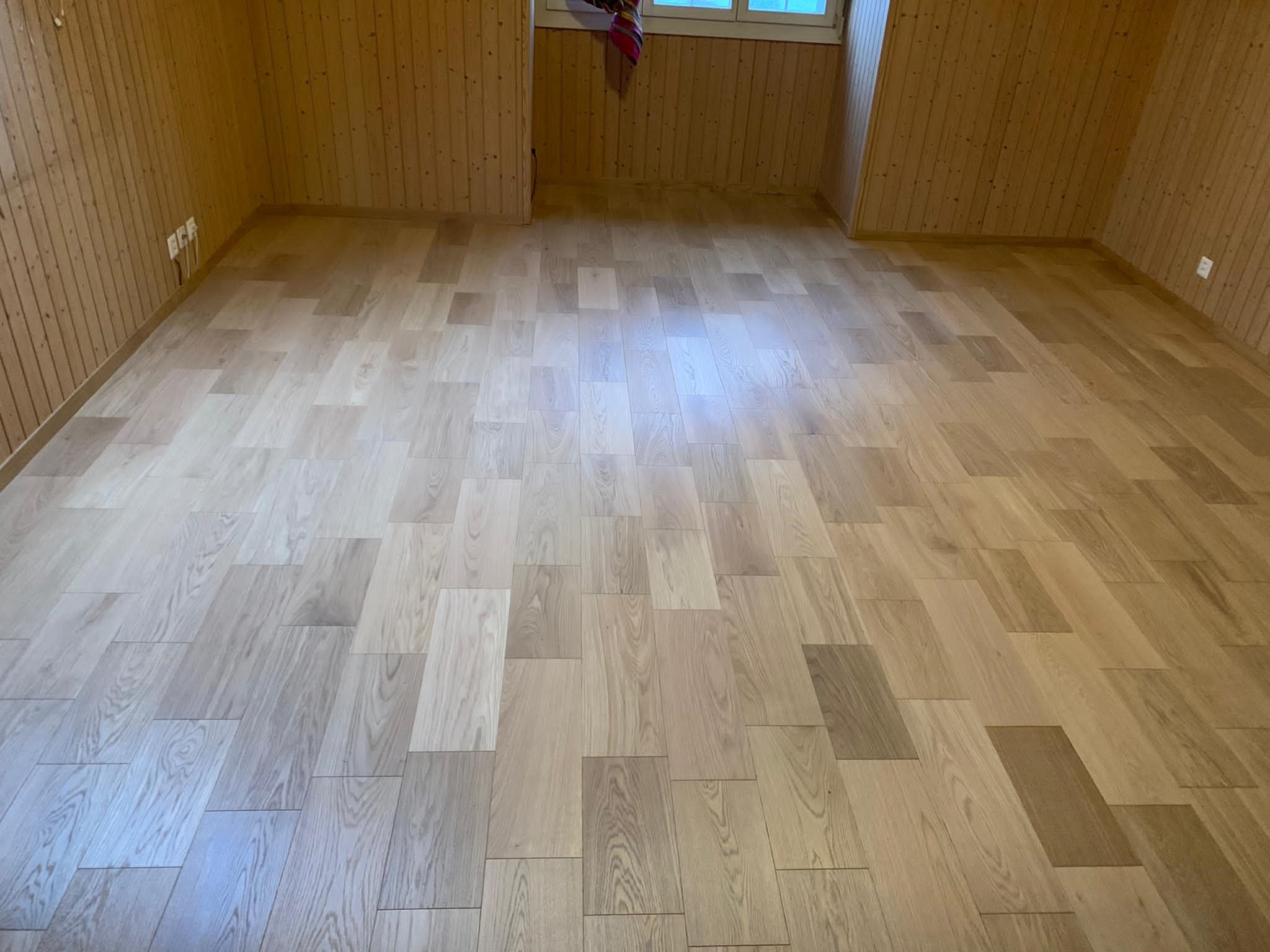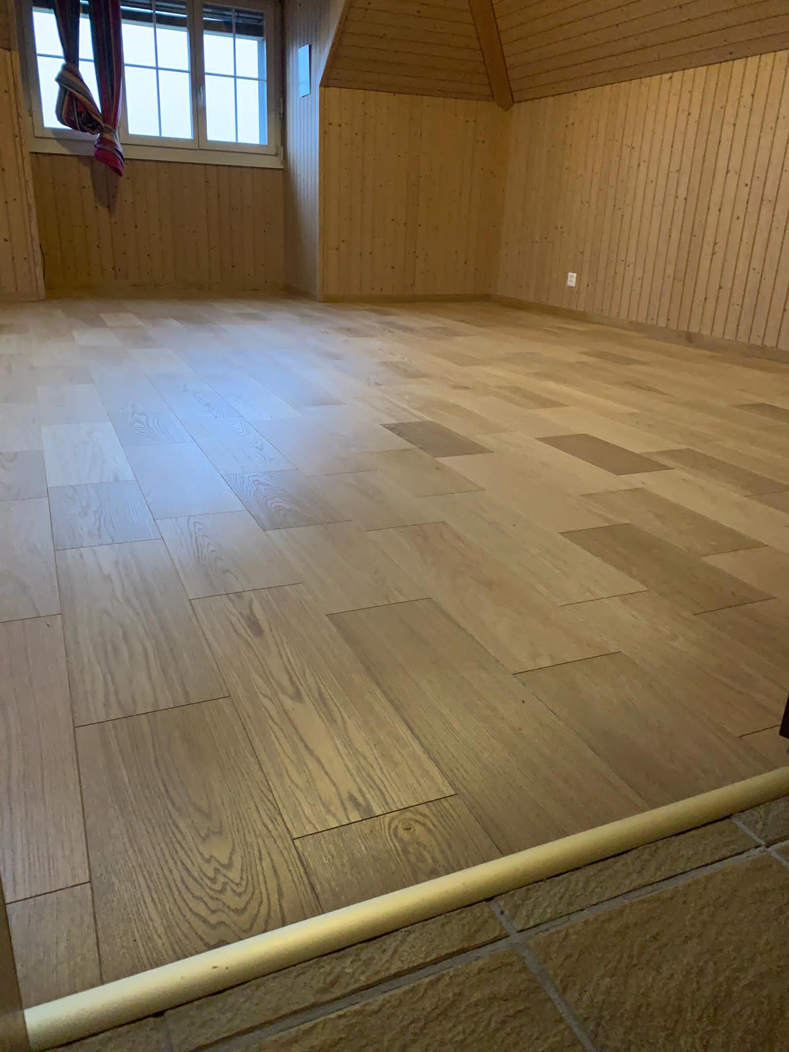 Parkett Bauwerk Formpark mini 570+380, Eiche 14 Avorio, tief gebürstet, geölt, wild verlegt