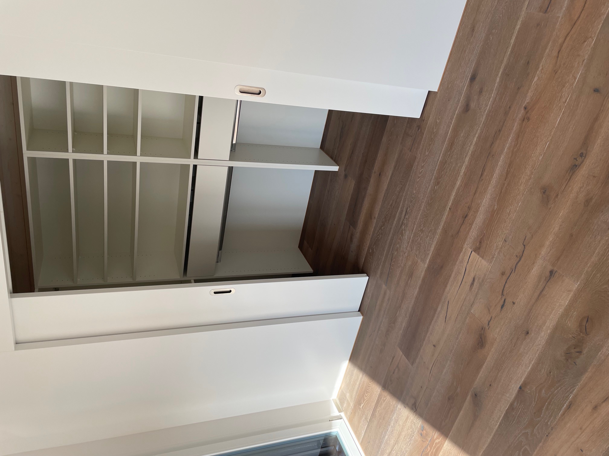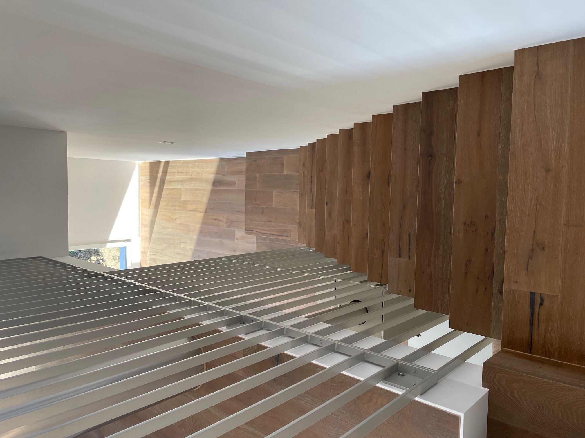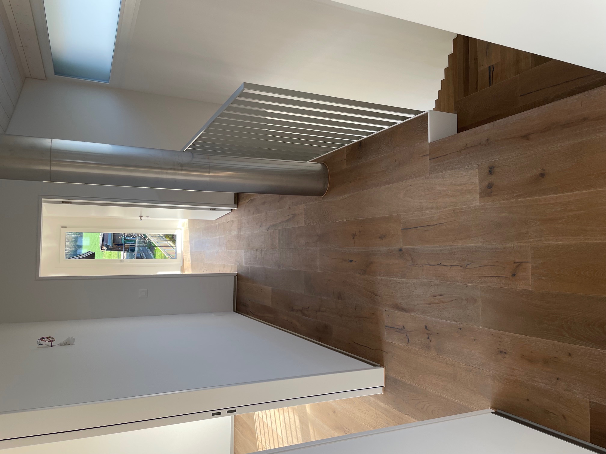 Parkett Küng-Plus Eiche Prato weiss geölt, angeräuchert, gebürstet, 1860x189x15 mmTreppe Küng-Plus Eiche Prato weiss geölt, angeräuchert, gebürstet auf Auftritt und Stirne inkl. Acrylfugen zur Wand, Aussenabschlüsse aus Parkettnutzschicht