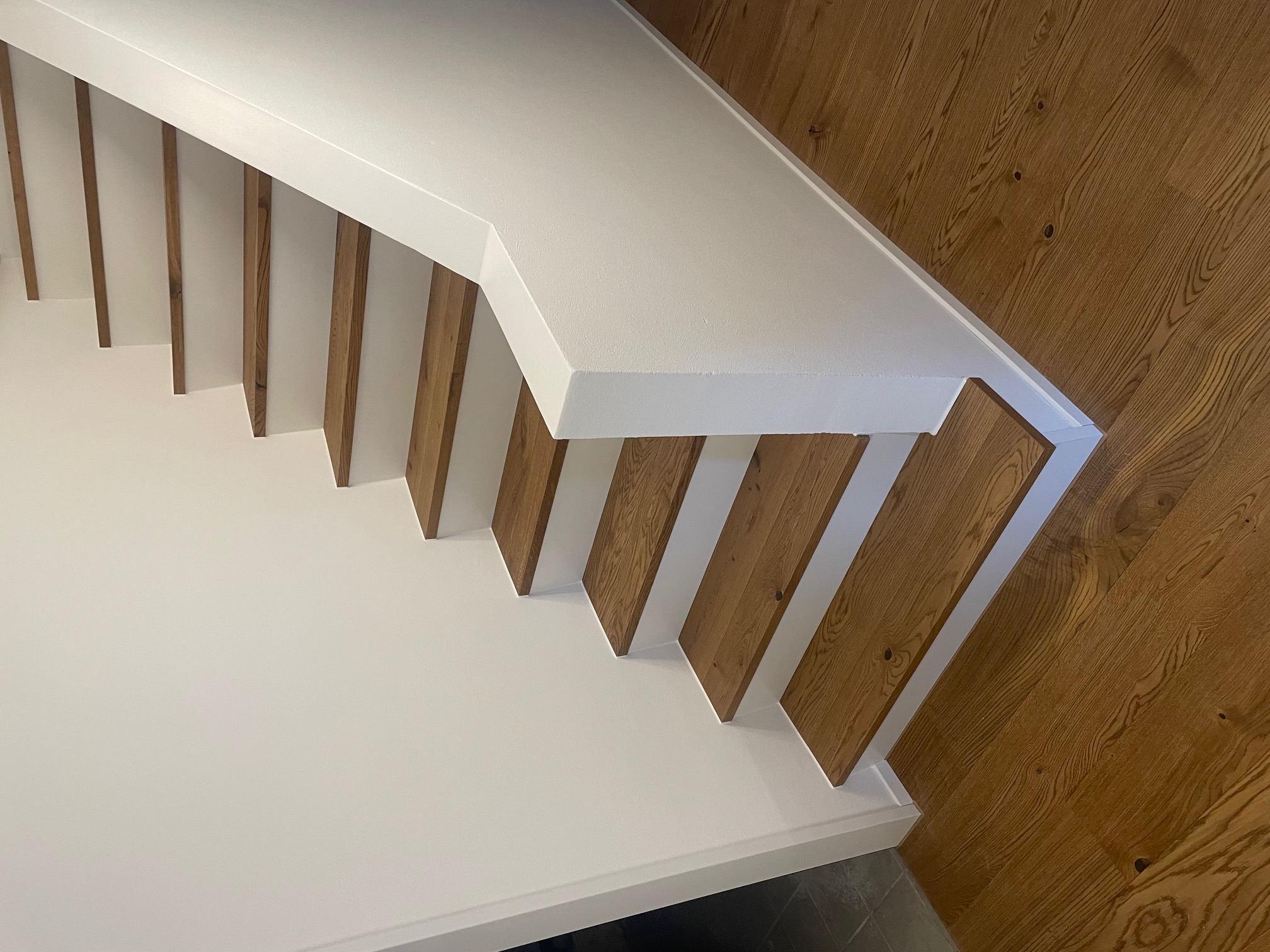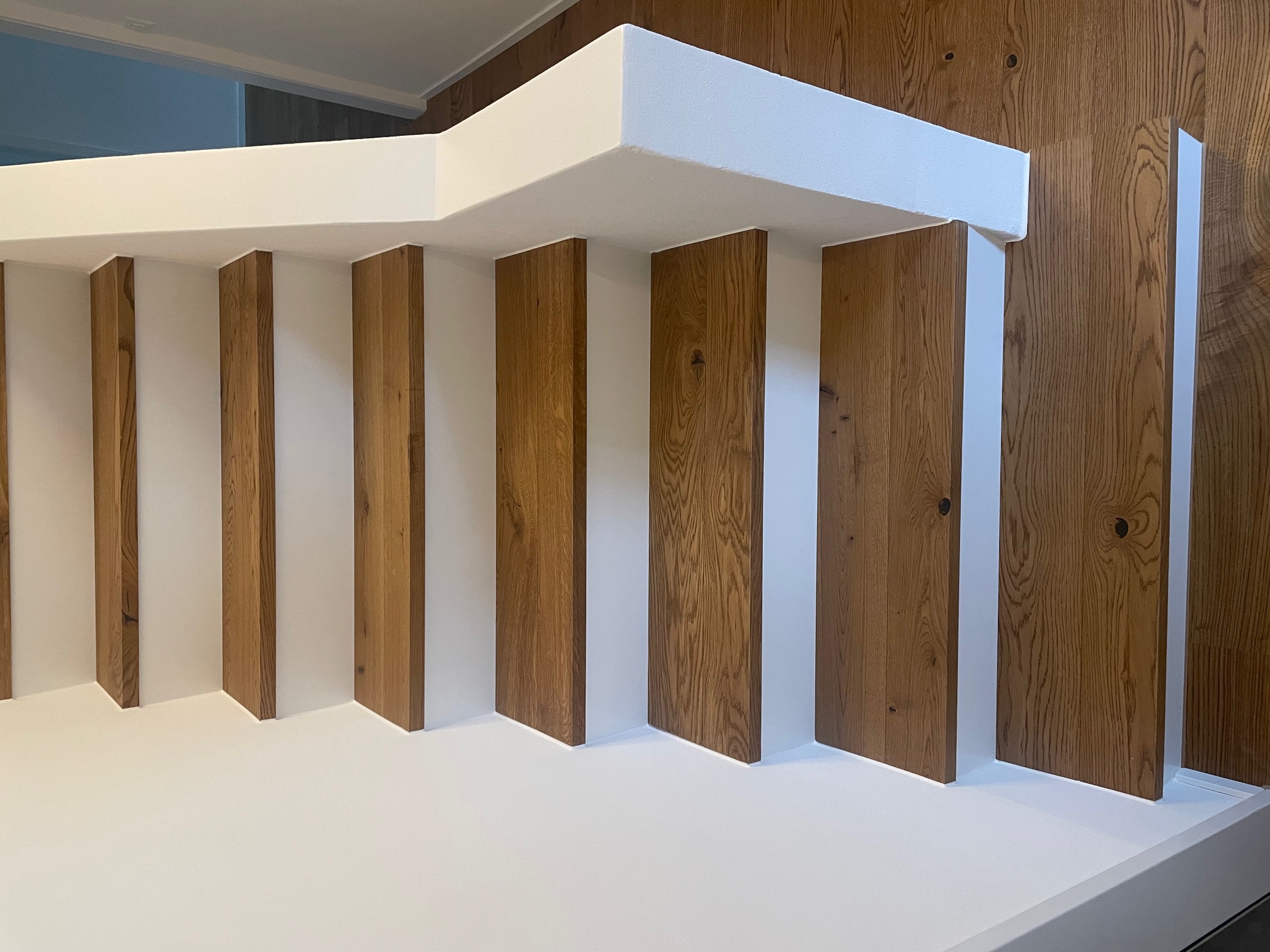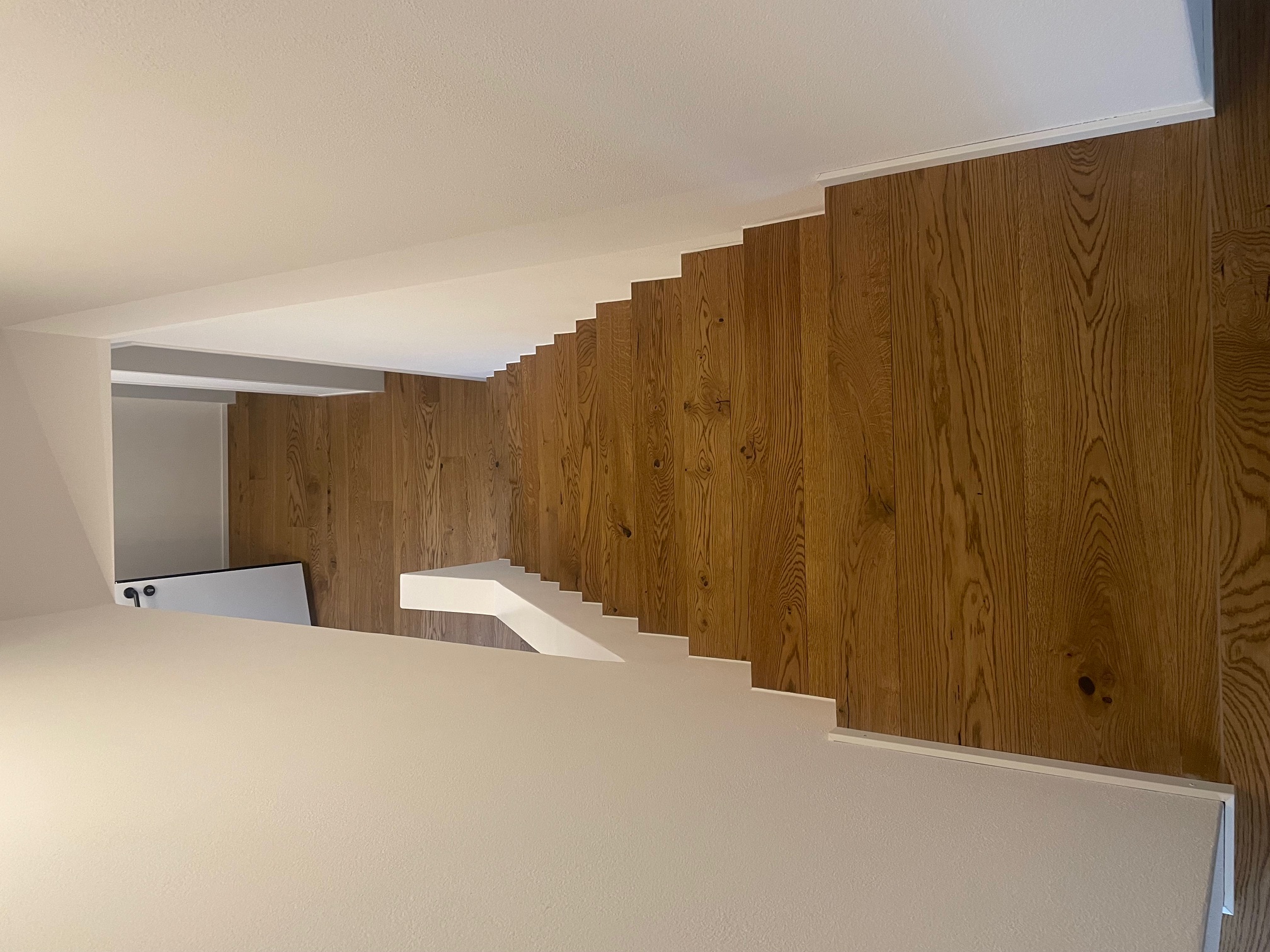 Treppe Boen Eiche Honey geölt, gebürstet auf Auftritt und Stirnkante 2 x abgebogen, Stirnbrett MDF weiss lackiert inkl. Acrylfugen an den Seitenränder