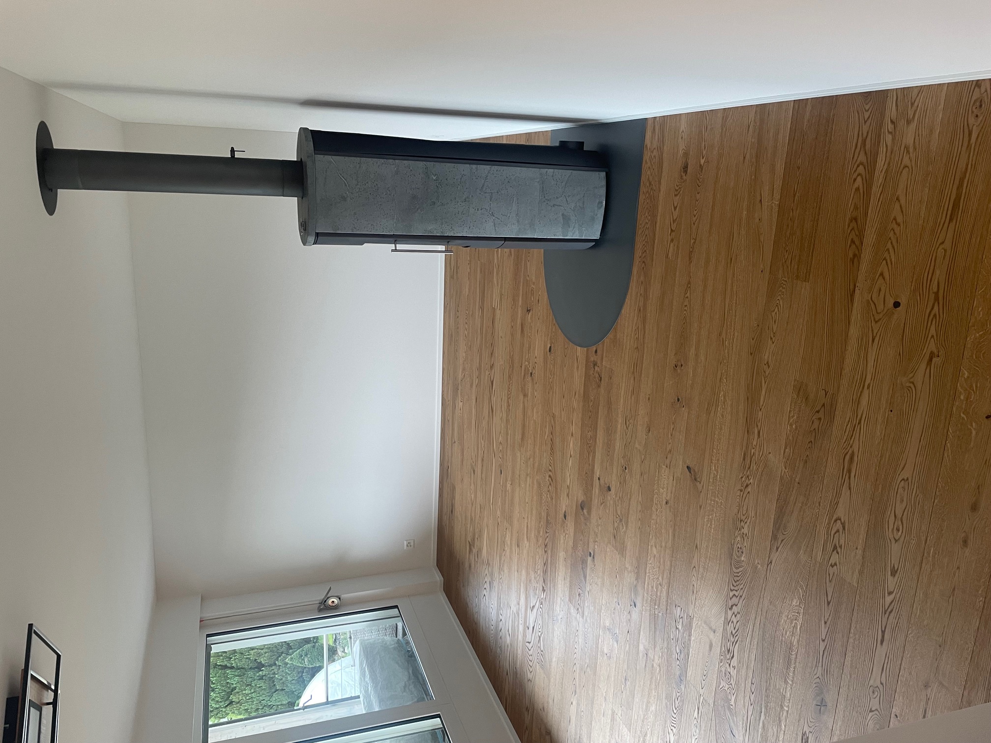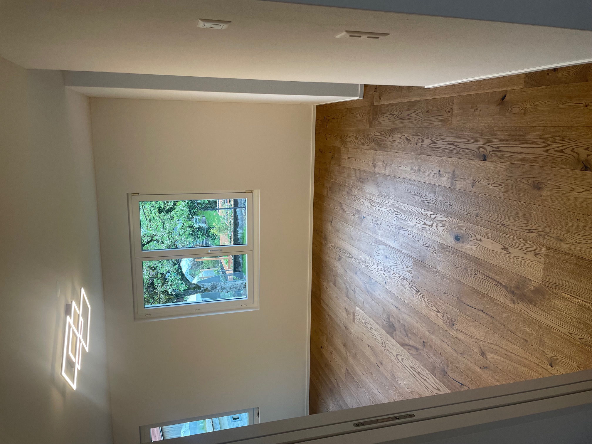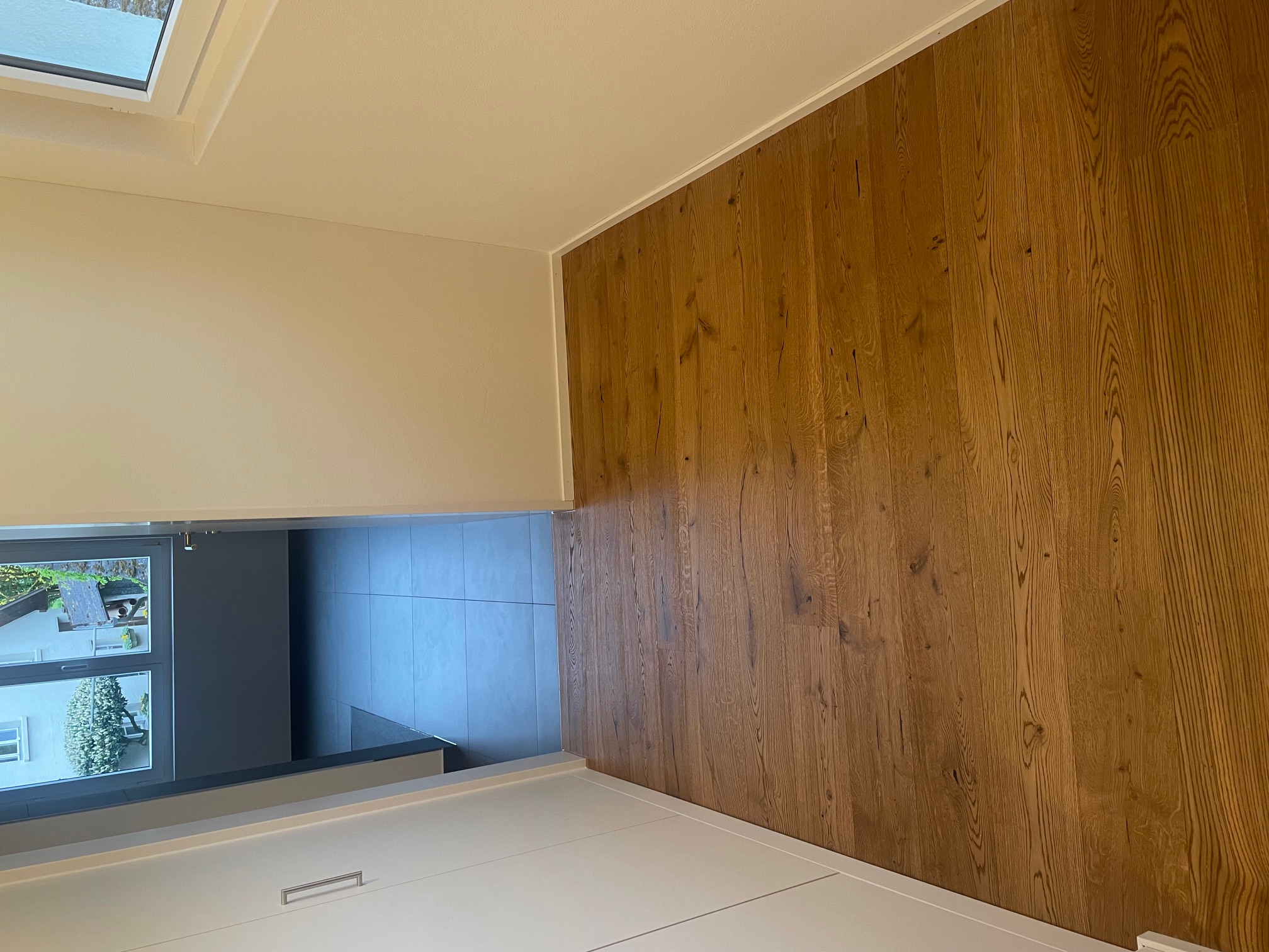 Treppe Boen Eiche Honey geölt, gebürstet auf Auftritt und Stirnkante 2 x abgebogen, Stirnbrett MDF weiss lackiert inkl. Acrylfugen an den Seitenränder