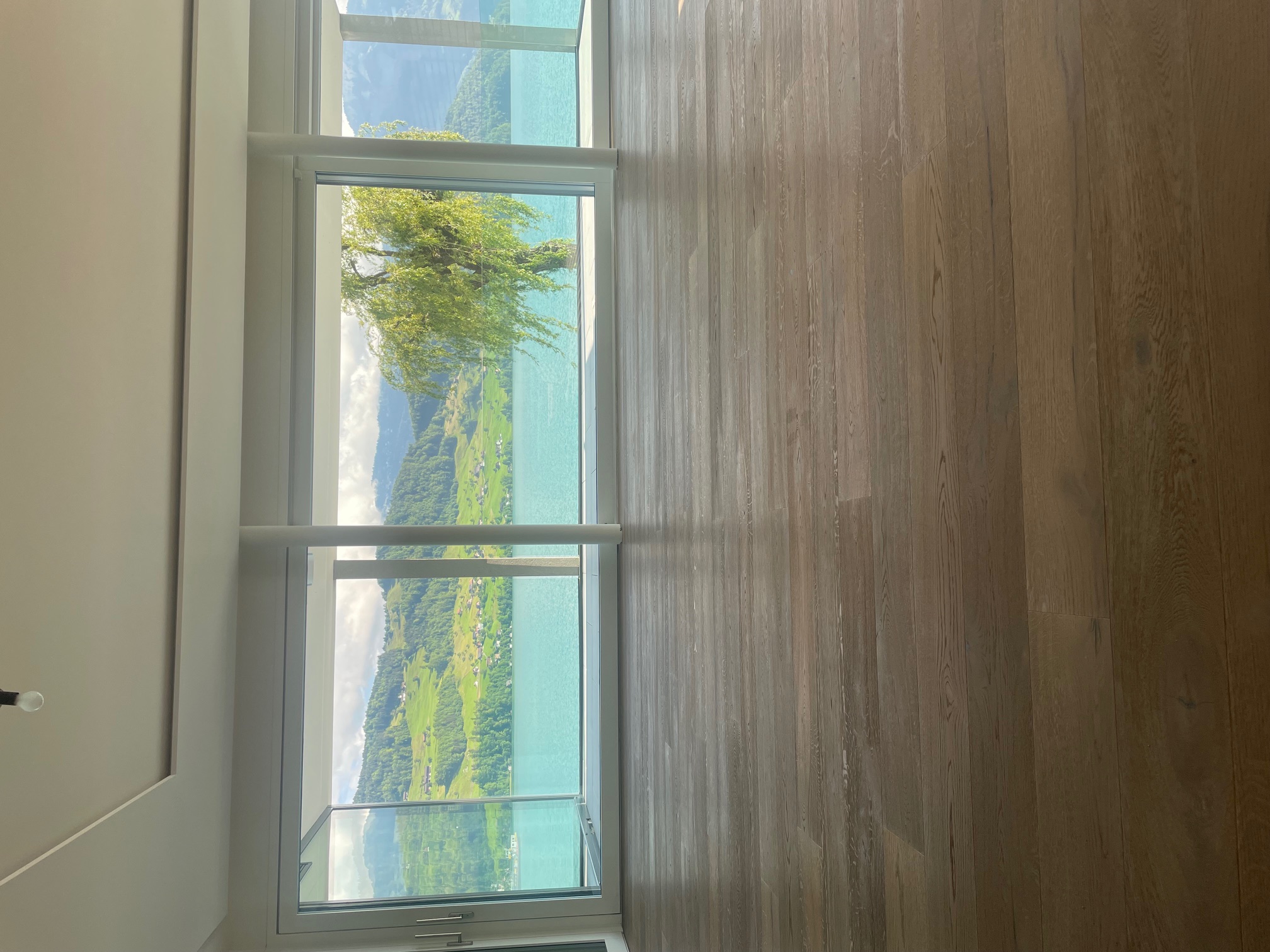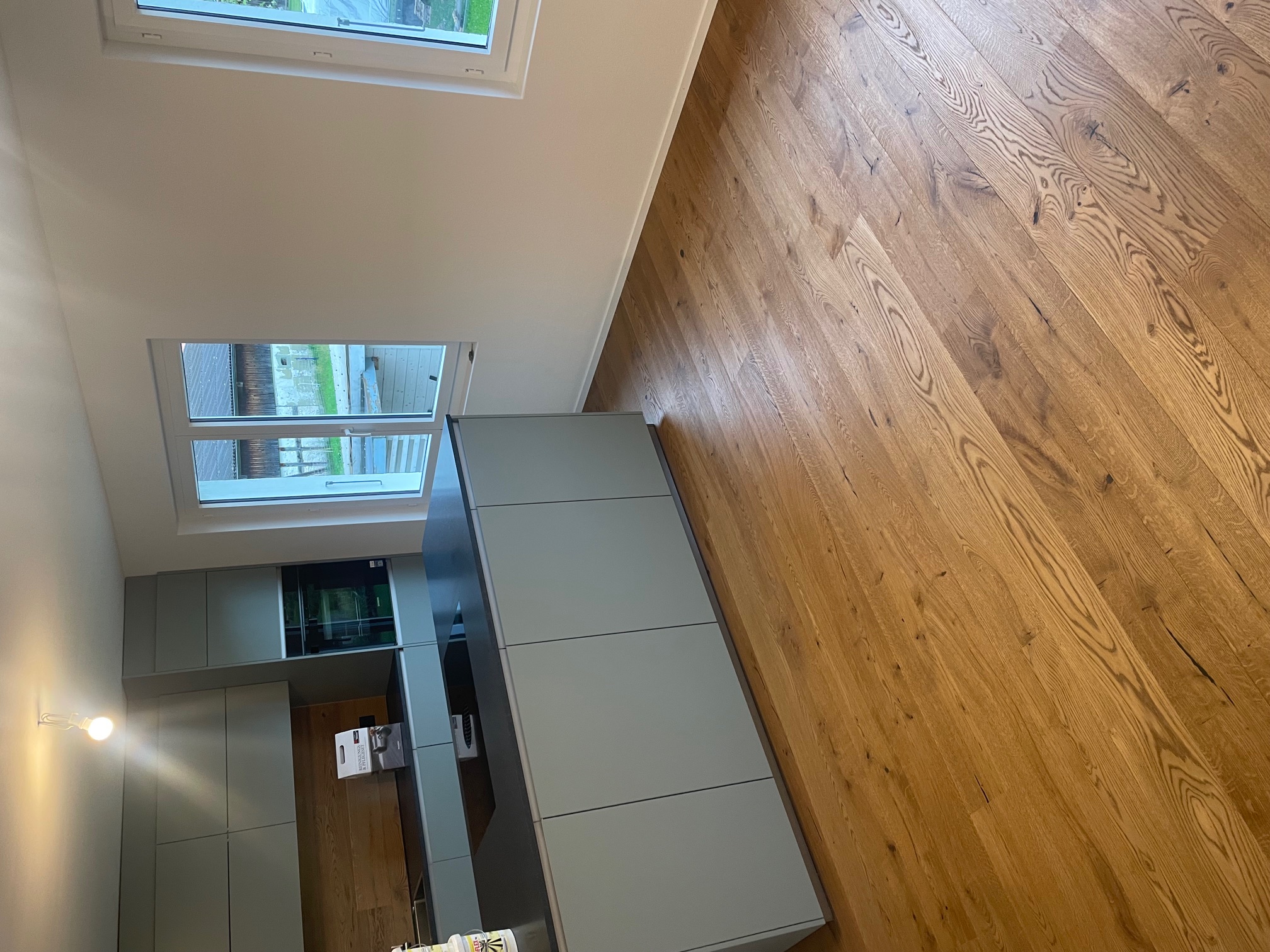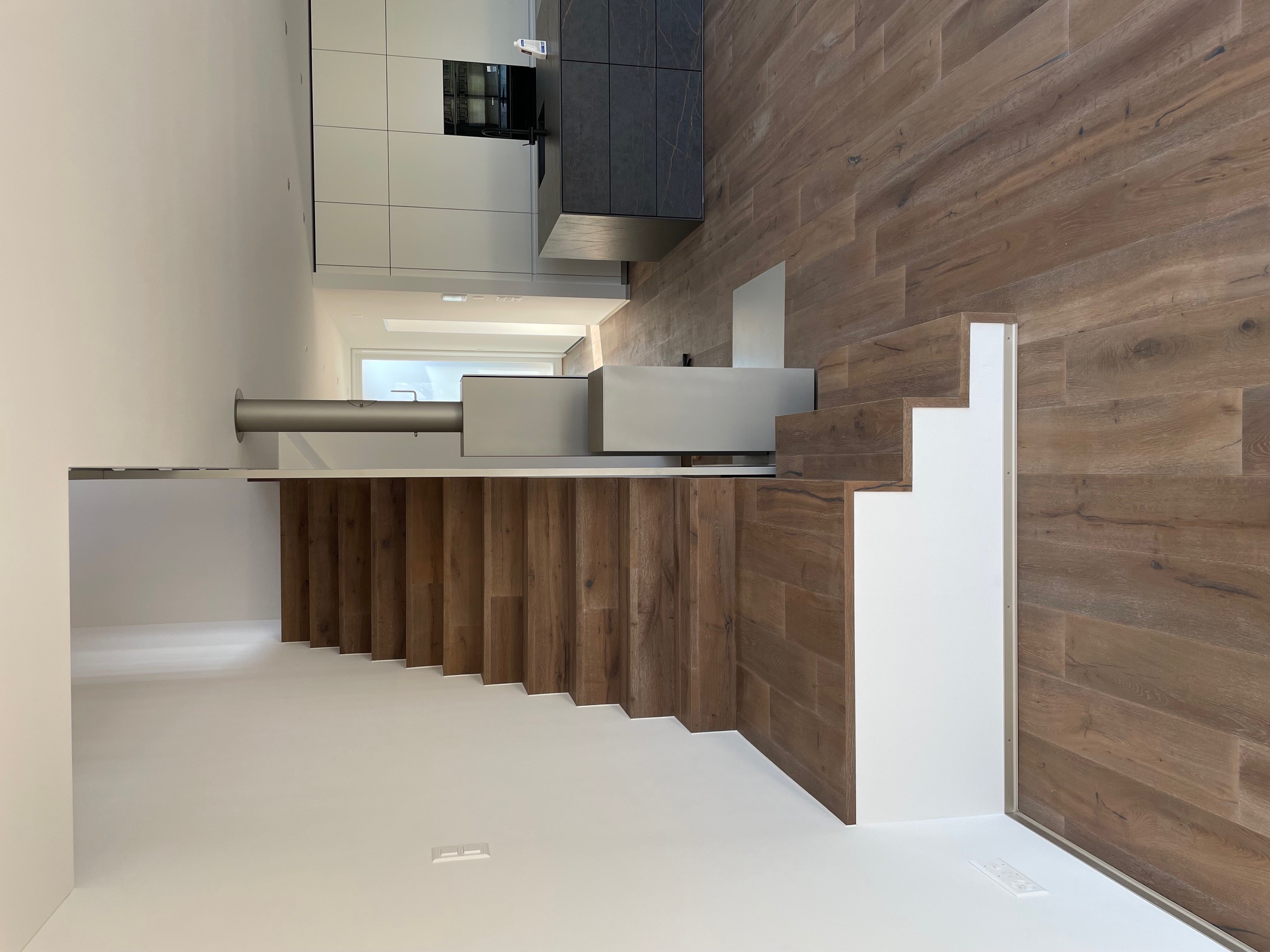 Treppe Küng-Plus Eiche Prato weiss geölt, angeräuchert, gebürstet auf Auftritt und Stirne inkl. Acrylfugen zur Wand, Aussenabschlüsse aus Parkettnutzschicht